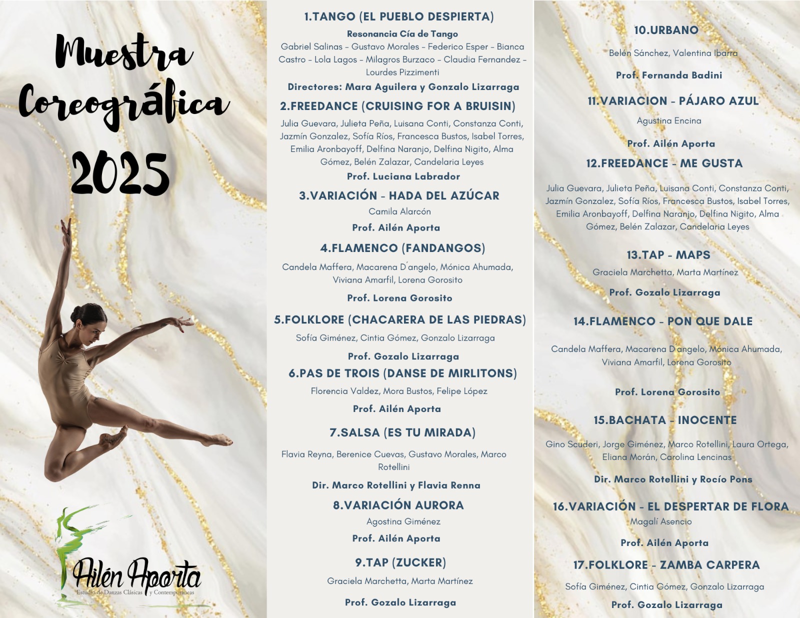 A continuación podrán acceder y descargar el programa de la Muestra Coreográfica anual 2025, de las diciplinas del estudio, tales como tango, Freedance, Flamenco, Folklore y Salsa entre otros.